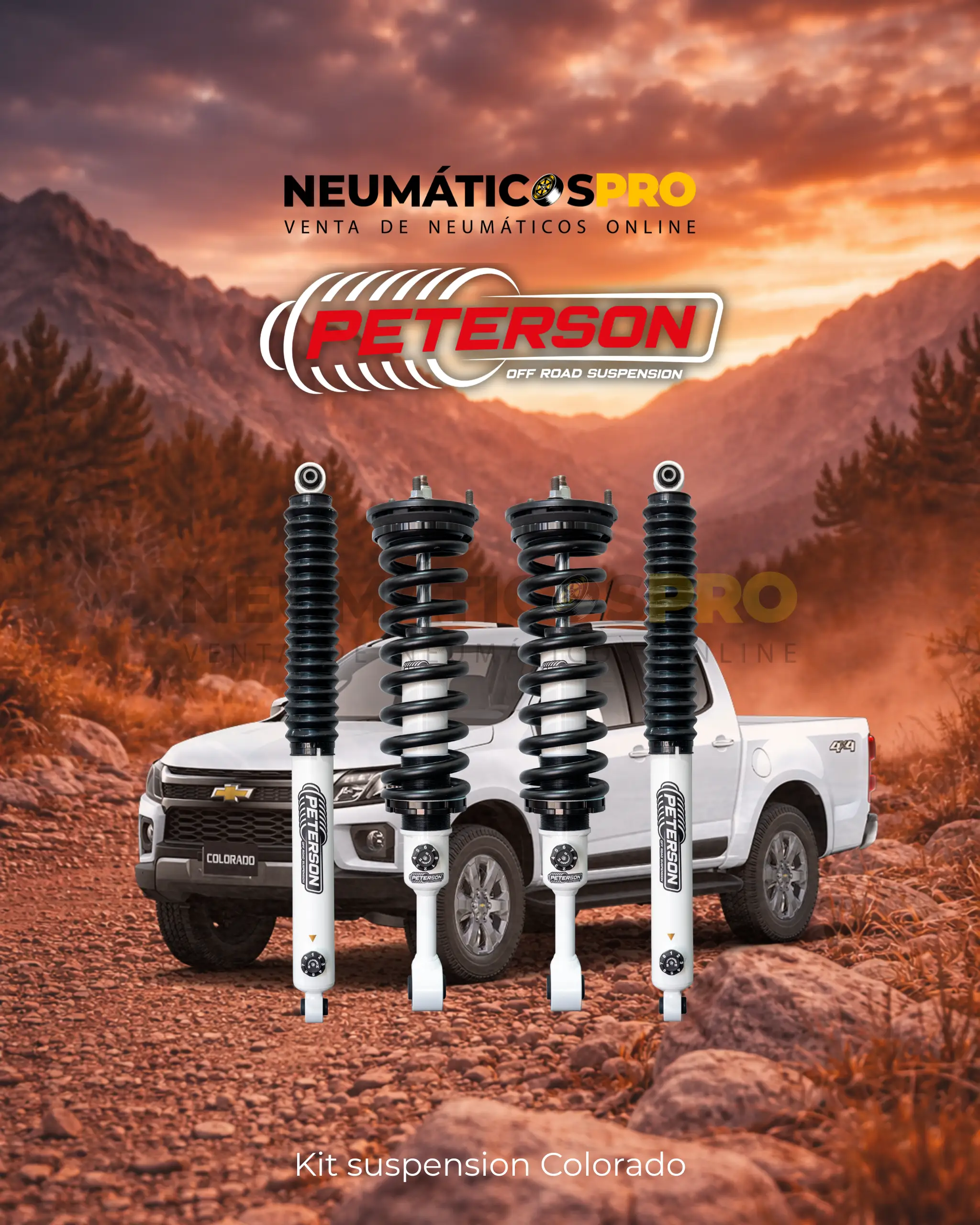 Kit de suspensión offroad de alto nivel, regulable y resistente, ideal para mejorar la postura, el confort y el desempeño de tu Chevrolet Colorado 2015 en adelante en ruta y fuera de ella.